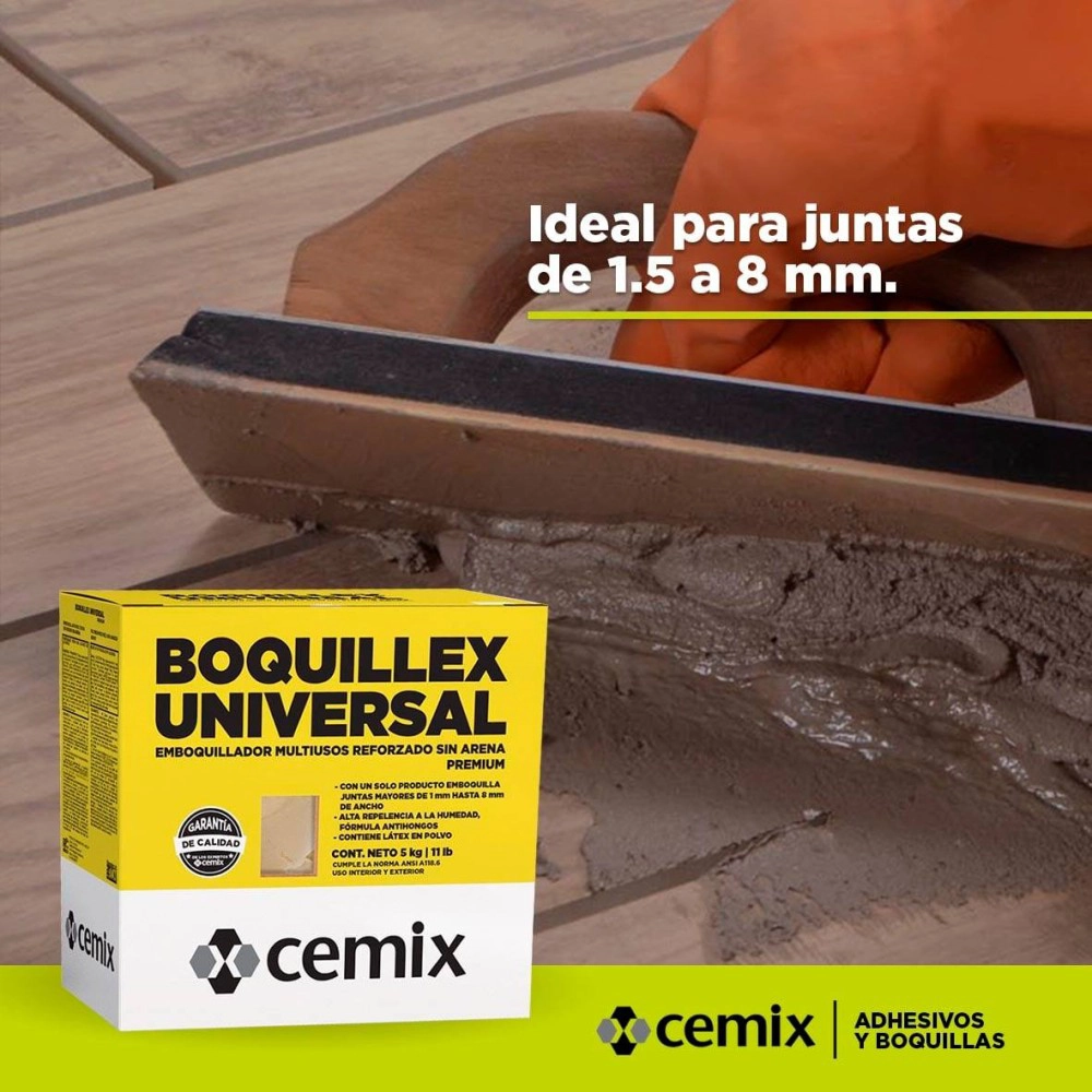 El BOQUILLEX UNIVERSAL CEMIX SIN ARENA, sirve para hacer emboquillado en instalaciones de revestimiento cerámico o porcelanatos de todo tipo, puede usarse para emboquillar o juntear mármol o mosaicos junteados en plantillas.