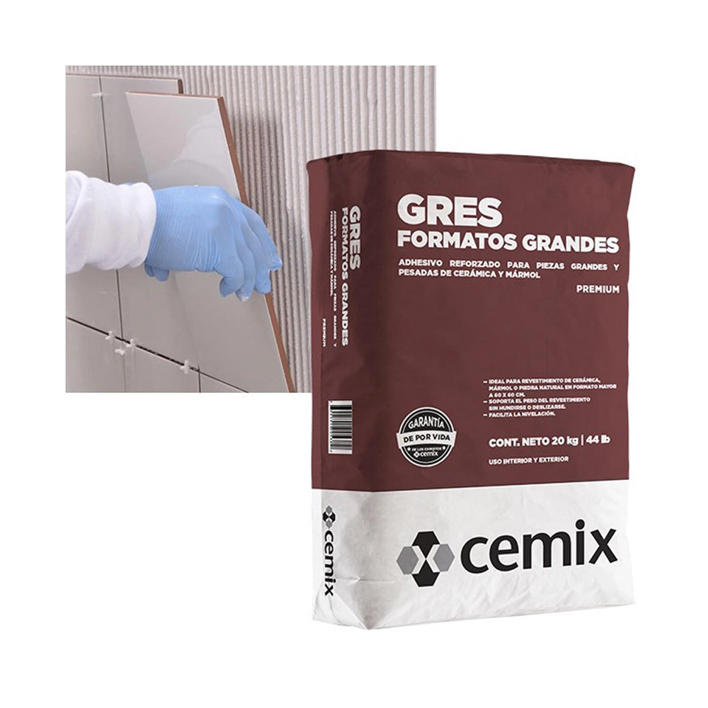 Adhesivo en polvo cemento portland blanco reforzado con aditivos especiales para instalar los nuevos formatos grandes y pesados de pisos y azulejos cerámicos o recubrimientos pétreos de alta, media y baja absorción de humedad.