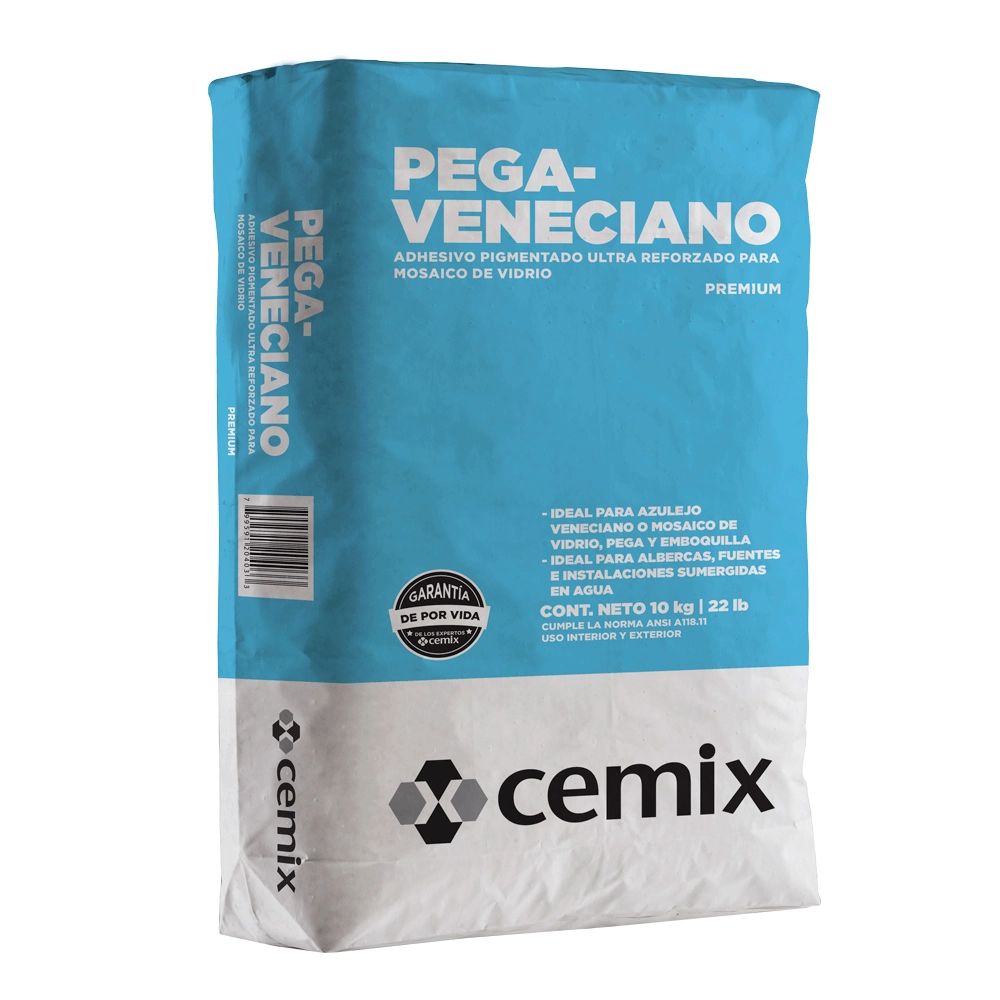 PEGAVENECIANO de CEMIX pega y emboquilla veneciano en albercas y fuentes, ideal para pegar cualquier loseta de vidrio o veneciano, el único adhesivo que pega y emboquilla a la vez, adherencia superior en la instalación de albercas, piscinas, jacuzzis, fuentes, etc.