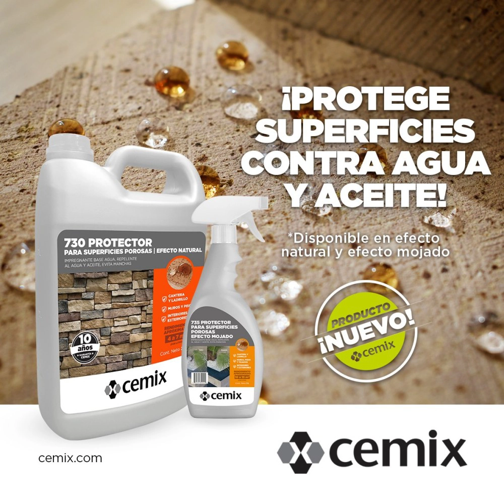 El PROTECTOR SUPERFICIES POROSAS/EFECTO NATURAL de CEMIX, es ideal para tratar superficies porosas como cantera, adoquines, teja de barro, ladrillo, concreto, mortero, estuco, etc puede utilizarse en edificios nuevos o antiguos, fachadas restauradas, terrazas, balcones etc, funciona en interior y exterior.